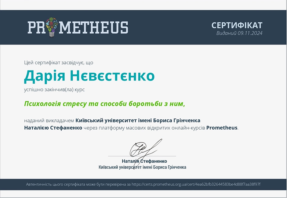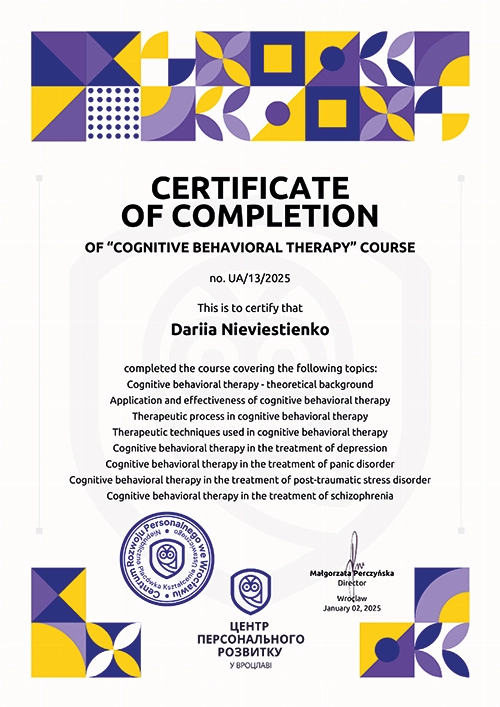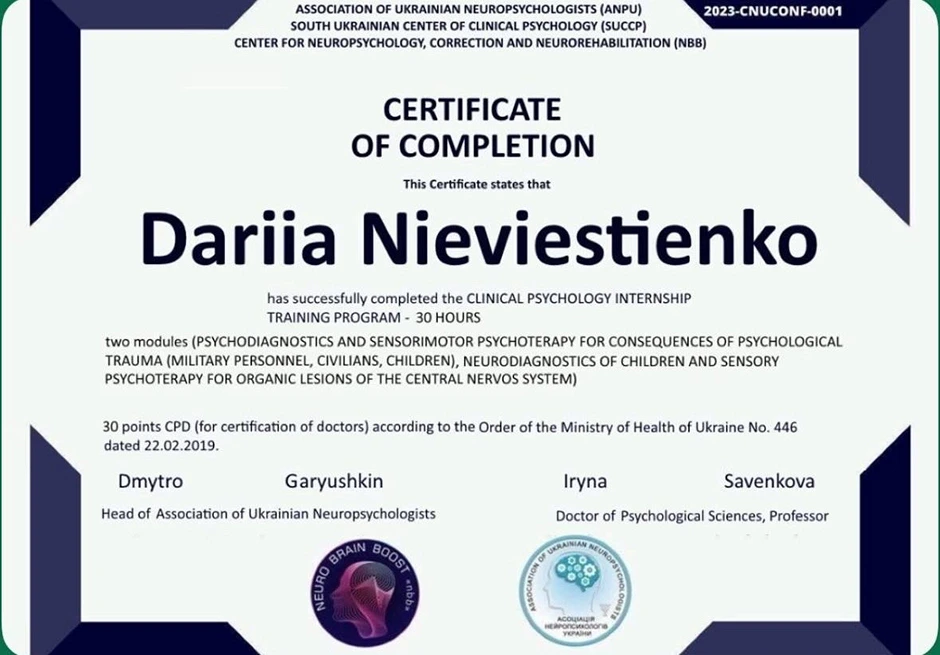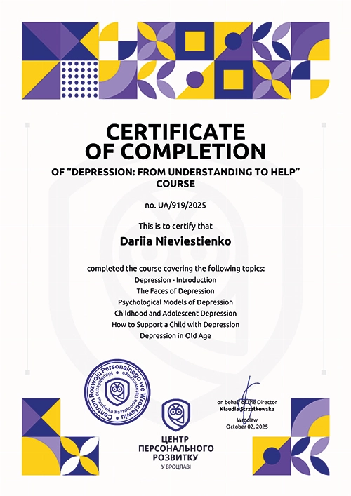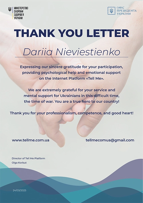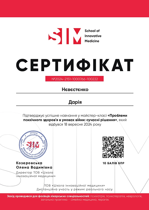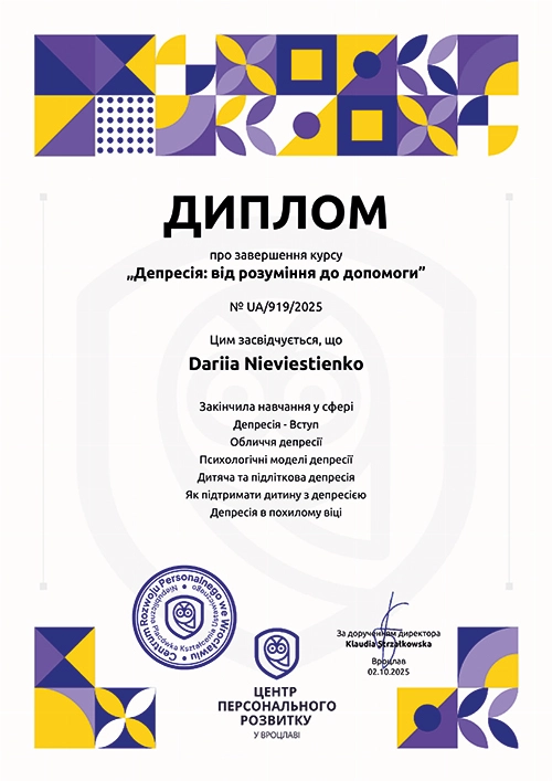 Дипломований клінічний психолог із практичним досвідом роботи в міжнародних організаціях (Німеччина) та медичній сфері. Спеціалізація — підтримка людей у складних життєвих обставинах та робота з емоційними розладами. Завдяки поєднанню клінічної психології та медичної освіти, фахівець має комплексне бачення того, як психіка та тіло взаємодіють під час стресу.